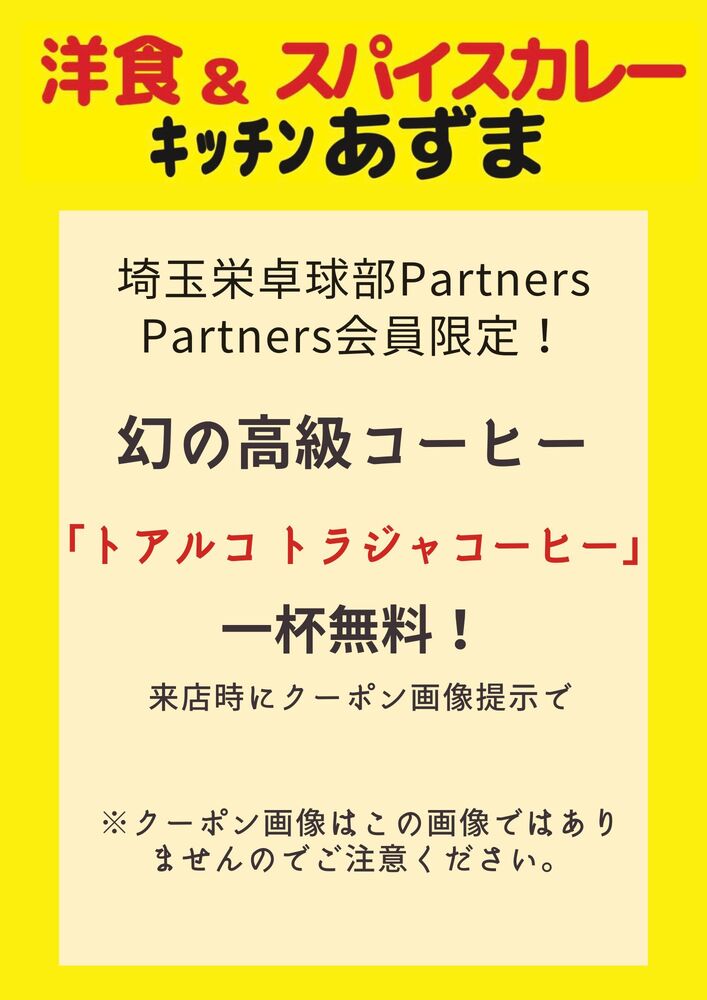 【埼玉栄Partners会員限定】「キッチンあずま」ページ内のクーポン提示で幻の高級コーヒー「トアルコトラジャコーヒー」一杯無料!